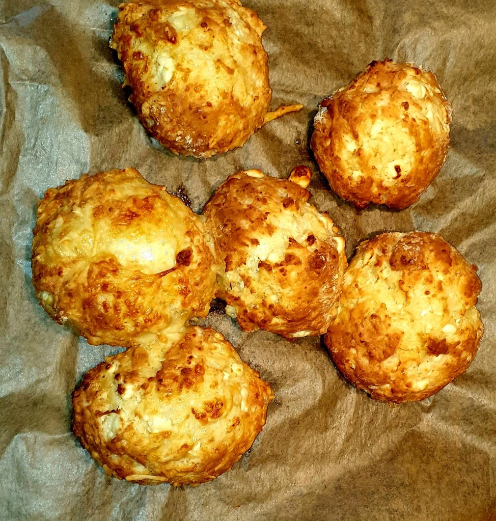 Mix the yogurt with the baking soda, add the cheese, salt, and flour. Make a soft bread dough. Divide into 4 -5 balls. Put a bit of butter on the top. Bake at 200 °C (~ 390 °F) until golden (about 20 minutes). Be patient and don’t eat immediately because may get burnt. I sometimes put inside grated gouda cheese with the feta. The most important is to keep the amount of cheese and yogurt equal. Also baking soda needs to be dissolved well in the yogurt. Some grated yellow cheese (gouda, cheddar) would make the breads even better. Put also some on the top as well.
