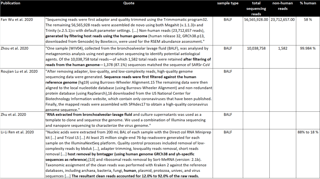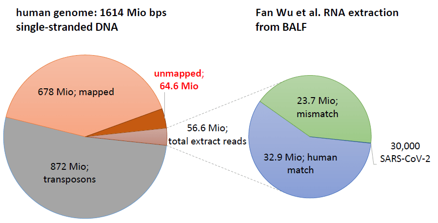 The sample will tell! Every analytical chemist can tell you: your sample tells you how you treated it. In case of Sars-CoV-2 virus recovery, the samples of total extracted RNA from bronchoalveolar lavage fluid (BALF) from patients with Covid symptoms contained millions of human genetic material and other microbial genetic material. Unless proven wrong, it may well be that the Sars-CoV-2 genetic sequence originates from the human genome – just like the other 60 % to 99 % of the BALF extracted sequence reads.