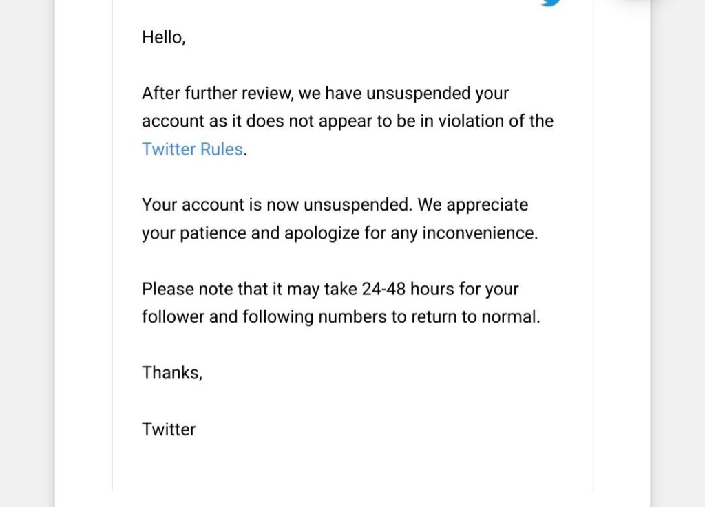 DonateDonate monthlyDonate yearlyIt looked as a normal day. I chatted with my pals on Telegram, and posted on Gettr and Facebook about what I thought was important. Just as I was going to start writing, I spotted another email from Twitter support. I was about to delete it because I expected the same response: my account has been permanently suspended. To my surprise, I was allowed to return, and Twitter even apologized.